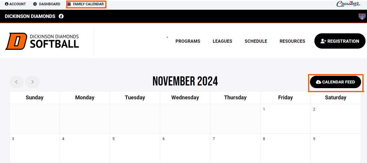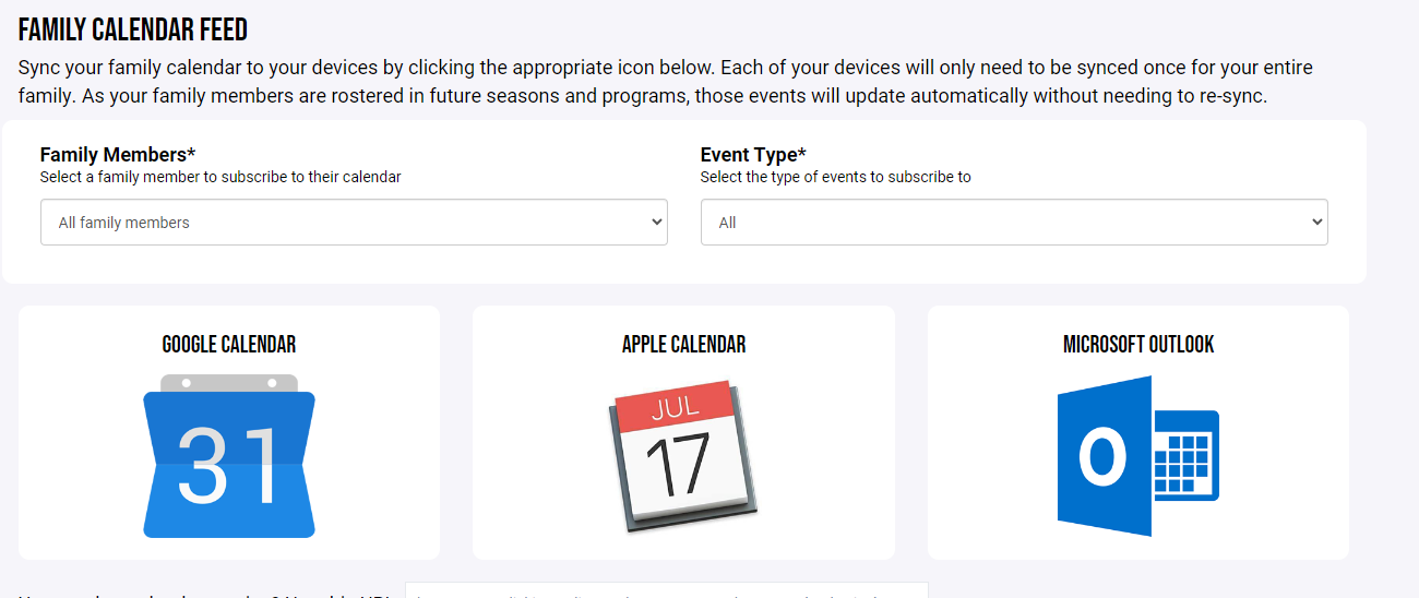 An awesome feature of Crossbar is that you can view your family's calendar easily and even sync of your family members' schedules and events to your personal calendar! To do this, simply log into our website and select Family Calendar, to view all activities for your players. To sync all activities to your personal calendar, click Calendar Feed.
